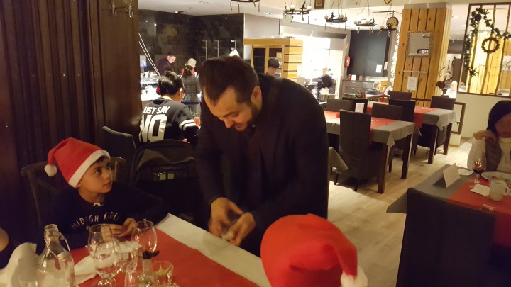 Dinner was meant to be a traditional Finnish Christmas dinner, however it seemed to be quite a generic buffet meal. They did have a magician who went table to table doing tricks. The boys were enthralled and Matthew even got to keep a magic con.