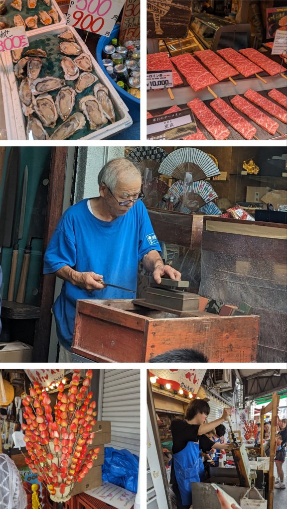 We then visited the Tsukiji Outer Market, which is a vast wet market with lots of stall selling food and produce. It was absolutely packed and we just walked around the outer ring of shops and saw some interesting food being prepared. There was a stall making flattened octopus which was served almost like a giant savoury biscuit. There was another stall making candied strawberries, which seemed to be quite a hit with the crowd. We also saw someone hand-sharpening knives.