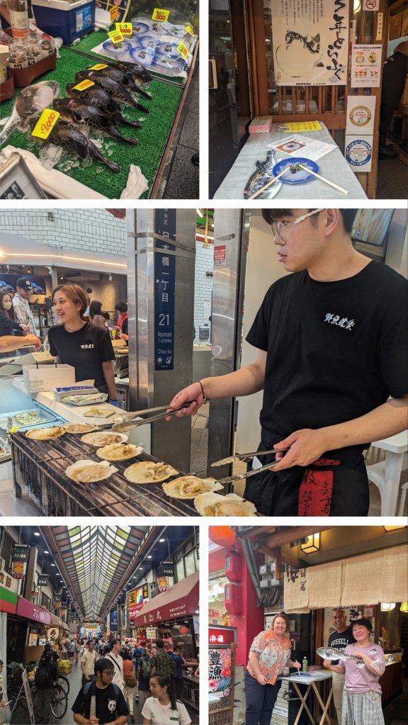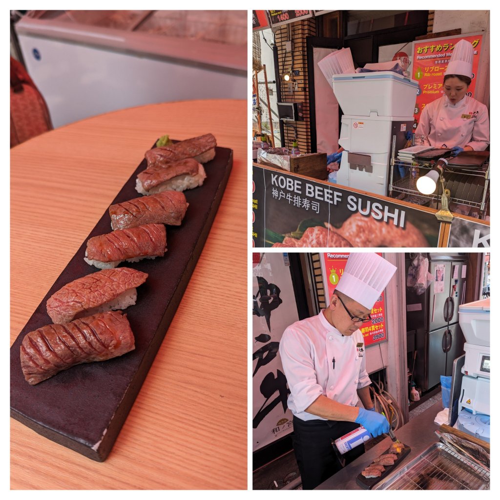 For a final day, I had organised a food tour through the streets of Osaka. Our guide picked us up from the hotel at 11:00 a.m. and we headed to the Dotonbori area. It was the same street we were at yesterday. However, this time our guide took us to all the little streets and restaurants hidden at the back. We started with a Kobe beef sushi street cafe where they prepared the meal in front of us. I’ve never had beef sushi before and it was quite a unique taste.