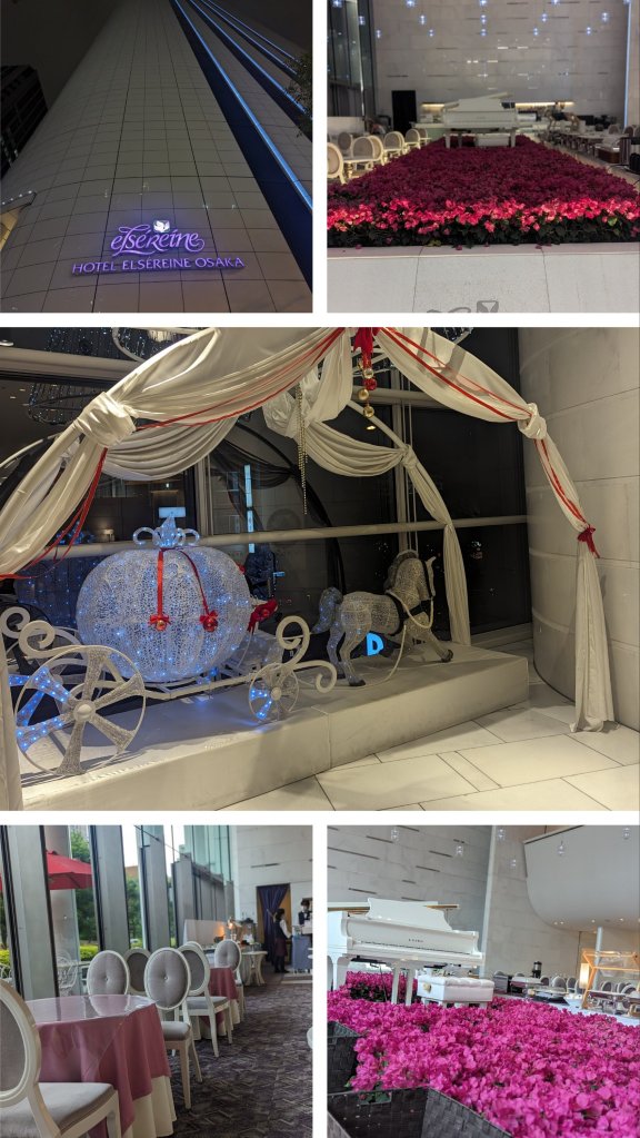 For our final night we stayed at probably the “kitschist” and pinkest hotel in Japan. It is a popular wedding destination and had pink lights and decorations all around. They even had a princess theme with Cinderella’s chariot and glass slipper on display. The breakfast restaurant had a sea of bright flowers with a white piano set in the middle.