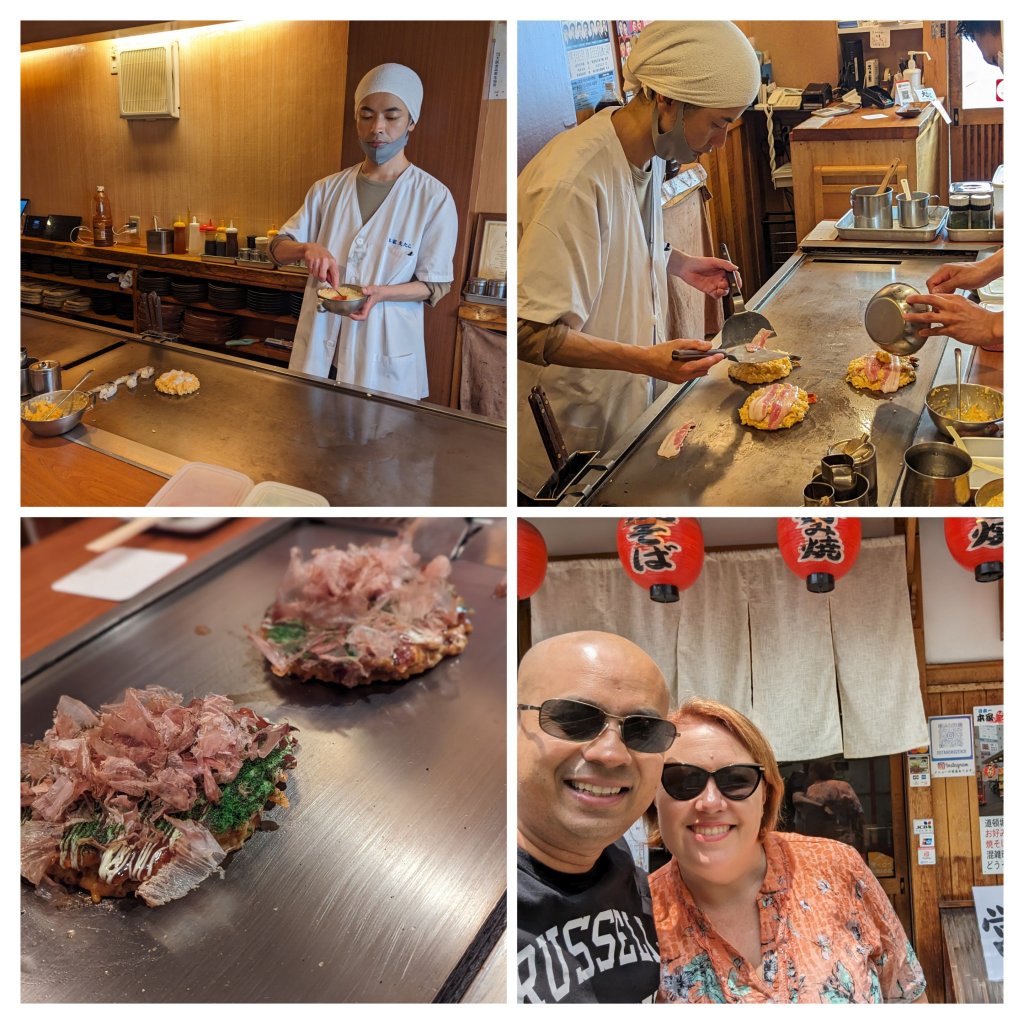 We followed this up by going to try Okonomiyaki – Japanese pancake/pizza. We had a mixed seafood version and the chef par cooks it and then puts it on a hot plate at the table to finish cooking. It’s topped with mayonnaise and spices and was quite delectable. Apparently different areas in Japan have different types of Okonomiyaki and you can tell the region by the way it’s made.