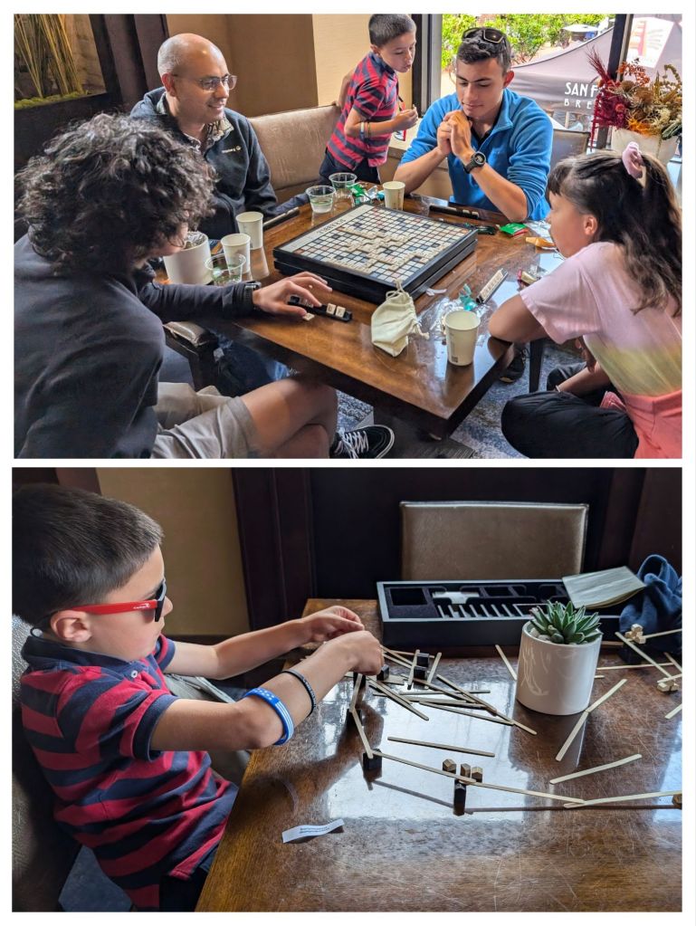 We stopped by Ghirardelli on the way back to the hotel to get some more chocolates and spent the afternoon in the gaming room. An intense game of Scrabble ensued which ended in a dead heat between Ben and Matthew. Thomas on the other hand built complex structures using stirrers.