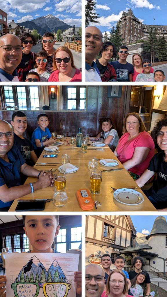We took a shuttle to the township of Banff and window shopped for an hour. Matthew lost his sunglasses on the flight over from Seattle yesterday so we got him a new pair. We went to a German restaurant called Waldhaus for dinner. Our waitress was Australian and originally from Adelaide. Thomas made her a little poster with “Aussie Aussie Aussie” on it.