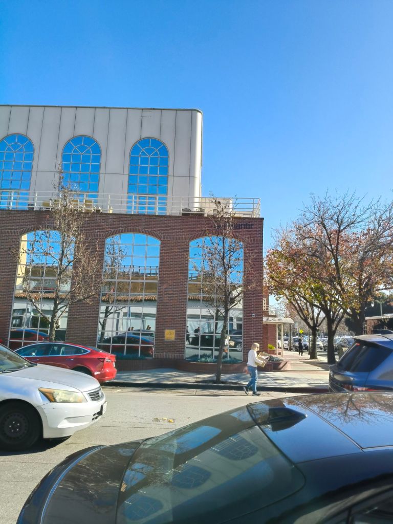 Today we had a much more leisurely start than yesterday. We only had to be up by 0900 with a muster time of 0950. We were given the opportunity to visit Palantir, who do not normally accept visitors, as well as have lunch with a couple of their engineers. Our wakeup was later than the day before which we thanked the stars for. After breakfast and our morning briefing, we were off. The ride to Palantir was fairly short and it was not long before we stopped outside a nondescript building. We stopped for a couple of minutes outside to confirm we were in the right location before we were led in the front door by security. We went through the typical sign in process and were led into a room that looked like it was built to be a safehouse. We were met by this guy named Alex, who was our presenter. The original plan was for Alex to present for half the time and Damian for the other but that was scrapped. We kept on asking questions of Alex and there just wasn’t enough time. Alex took us through their work in development of the couple of products they offer. He also explained that he couldn’t go into any details cause of their work with “3 Letter Agencies”. It was fascinating to look through their history and see what made the company they evolved into. After Alex’s talk we were taken to the lunch area which happened to be in a completely different building. The exterior of which was the best building we have visited on this trip.